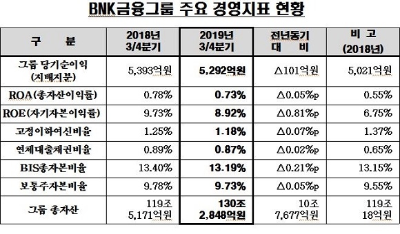이는 전년동기대비 1.9%(101억원) 감소한 실적이지만 판매관리비 회계처리 변경에 따른 일시적 비용(309억원) 증가 영향을 감안하면 실질적으로는 증가한 실적이라고 BNK금융은 설명했다.