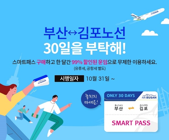 에어부산이 김포-부산 노선을 횟수 제한 없이 99% 할인받을 수 있는 ‘스마트패스’ 정기 할인권을 출시했다고 1일 밝혔다.