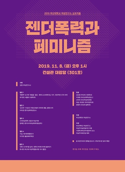부산대학교 여성연구소는 ‘젠더폭력과 페미니즘’을 주제로 오는 8일 오후 1시 교내 건설관 대강당(301호)에서 ‘2019 부산대학교 여성연구소 심포지엄’을 개최한다고 5일 밝혔다.