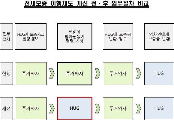 최근 주거약자인 임차인이 임대인으로부터 전세보증금을 돌려받지 못하는 사례가 늘어남에 따라 전세보증 이행 과정에서 HUG가 주거 약자를 대신해 주택 임차권 등기명령을 신청하도록 개선된다.