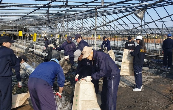 이번 일손돕기에는 창원대산농협, 해군장병, 군무원 40여 명이 참여해 화재로 전소된 하우스 파이프와 보온덮개 등의 철거작업을 도왔다.