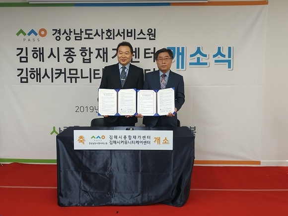 이날 협약식은 경남사회서비스원 소속기관인 종합재가센터, 커뮤니티케어센터 개소식과 함께 진행됐다. 이 자리에는 조현명 김해시 부시장, 이성기 경남사회서비스원장 등 관계자 10여명이 참석했다.