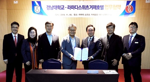 이날 협약식에는 경남대 최호성 대외부총장과 거제 라마다 스위츠 거제호텔 정행철 대표이사를 비롯해 경남대 관광학부 선종갑, 박한수 교수 및 관계자들이 참석했다.