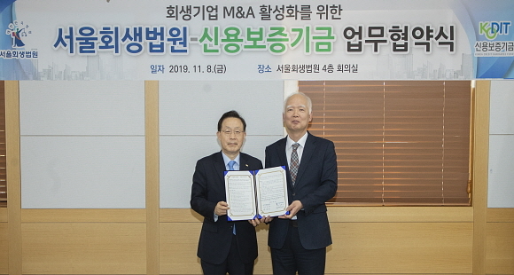 신용보증기금(신보)과 서울회생법원이 8일 서울회생법원에서 ‘회생기업 인수합병(M&A) 활성화 위한 업무협약’을 맺었다고 밝혔다.