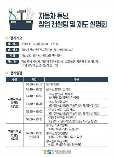 한국교통안전공단(이라 공단)은 오는 12일 경상북도, 김천시와 함께 김천 산학연유치지원센터에서 ‘자동차 튜닝 창업 컨설팅 및 제도 설명회’를 개최한다고 11일 밝혔다.