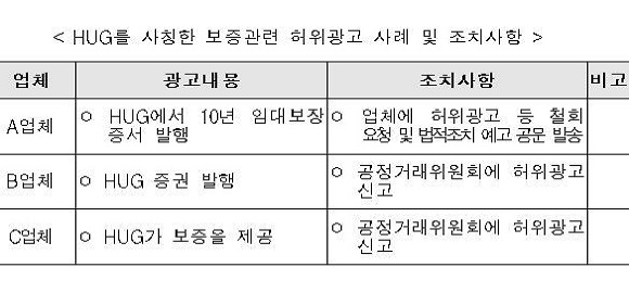 때문에 허위 광고로 의심될 경우 보증 가입 여부를 확인한 뒤 계약을 진행하는 것이 좋다고 HUG는 덧붙였다.