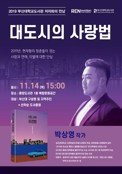 부산대학교 도서관은 오는 14일 오후 3시부터 2시간 동안 교내 중앙도서관 1층 복합문화공간에서 청춘의 사랑과 이별을 그린 소설 ‘대도시의 사랑법’의 저자 박상영 작가를 초청해 저자와의 만남 행사를 개최한다고 12일 밝혔다.