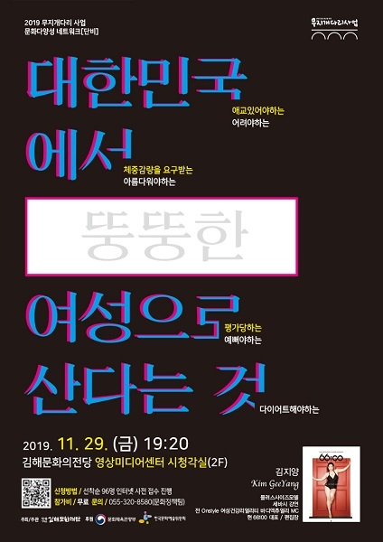 (재)김해문화재단은 오는 29일 오후 7시 20분 김해문화의전당 영상미디어센터 시청각실에서 ‘대한민국에서 (뚱뚱한) 여성으로 산다는 것 With 김지양’ 강연을 진행한다고 12일 밝혔다.