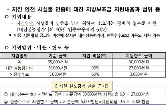 이번 사업을 통해 시는 내진 성능 평가 비용을 최대 2700만원, 인증 수수료는 최대 300만원을 지원할 예정이다.