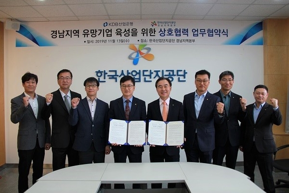 한국산업단지공단 경남지역본부와 한국산업은행 영남지역본부는 13일 산단공 경남본부에서 '경남지역 유망 중소·중견기업 발굴 및 육성'을 위한 업무협약을 체결했다.