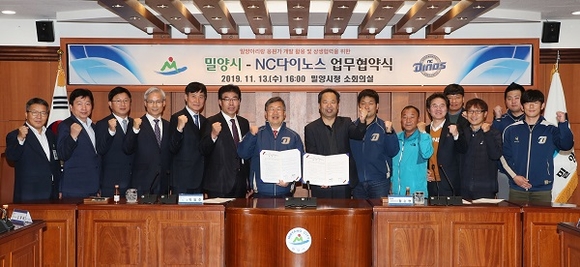 경남 밀양시와 NC 다이노스가 13일 밀양시청 소회의실에서 박일호 밀양시장과 황순현 대표이사가 참석한 가운데 밀양아리랑 응원가 개발 활용과 상생협력을 위한 협약을 체결했다.