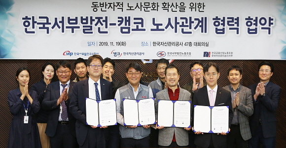 한국자산관리공사(캠코)와 한국서부발전이 19일 오전 11시 부산국제금융센터(BIFC) 캠코 본사 47층 대회의실에서 ‘노사 관계 협력 위한 업무협약’을 체결했다고 밝혔다.