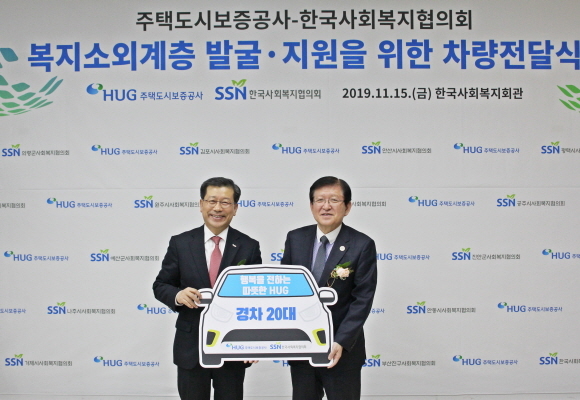 주택도시보증공사(HUG)가 지난 15일 한국사회복지회관에서 ‘사회복지기관 차량 전달식’을 열고 한국사회복지협의회를 통해 20개 기관에 차량을 지원한다고 19일 밝혔다.