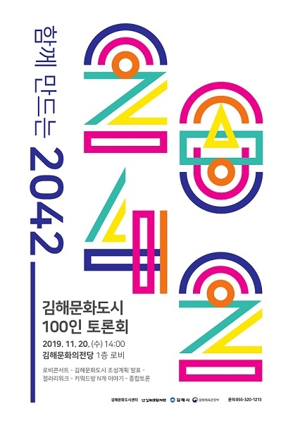 (재)김해문화재단 문화도시센터는 오는 20일 ‘문화도시 100인 토론회’가 오는 김해문화의전당 로비에서 열린다고 19일 밝혔다. 이번 토론회는 가야건국 2000년을 맞는 2042년의 문화도시를 비전으로 준비됐다.