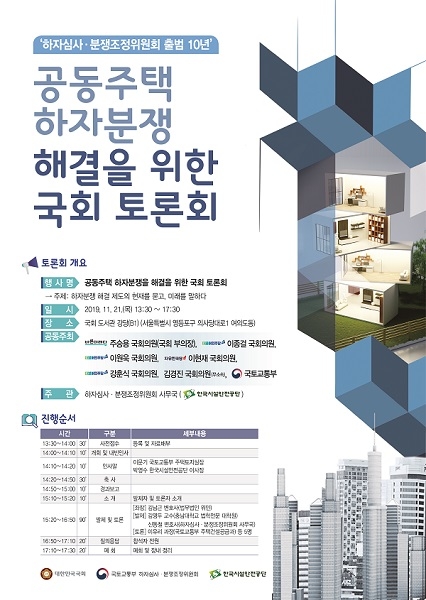 이번 토론회는 주승용 국회부의장, 이종걸 국회의원, 이원욱 국회의원, 이현재 국회의원, 강훈식 국회의원, 김경진 국회의원, 국토교통부가 공동 주최, 하자심사·분쟁조정위원회사무국 주관으로 진행된다.