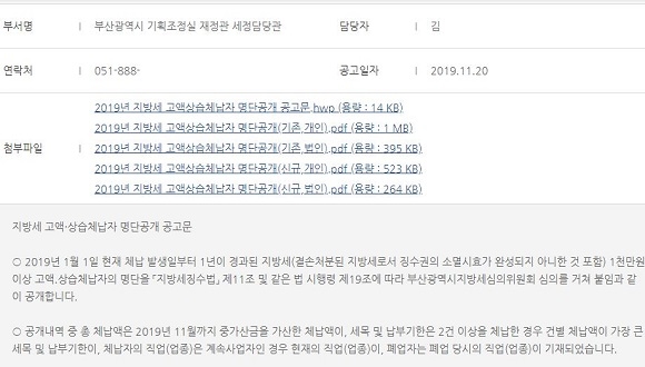 부산시가 1000만원 이상의 지방세 고액 상습 체납자 551명의 명단과 지방세외수입금 고액 상습 체납자 85명의 명단을 오늘(20일) 오전 9시 시 홈페이지와 사이버지방세청에 공개했다.