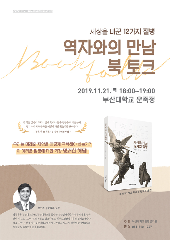 부산대학교는 질병을 통해 역사를 바라본 도서 ‘세상을 바꾼 12가지 질병’(부산대 출판문화원, 2019.7.15.)을 최근 번역·출간한 본교 의학과 장철훈 교수가 북토크 행사를 개최한다고 20일 밝혔다. 이 책은 2007년 미국에서 출판됐으나 국내 번역본으로 소개된 것은 이번이 처음이다.