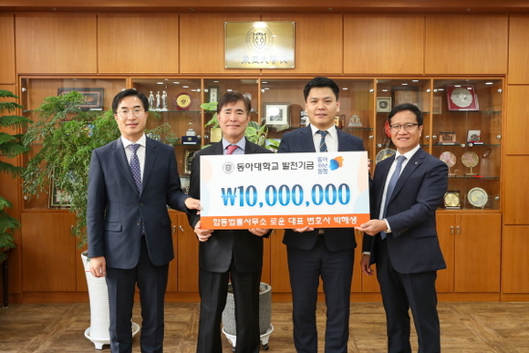 동아대학교는 ‘합동법률사무소 로운’의 박해생 변호사가 학교사랑 캠페인 ‘동아 100년 동행’ 발전기금으로 1000만 원을 기부했다고 25일 밝혔다.