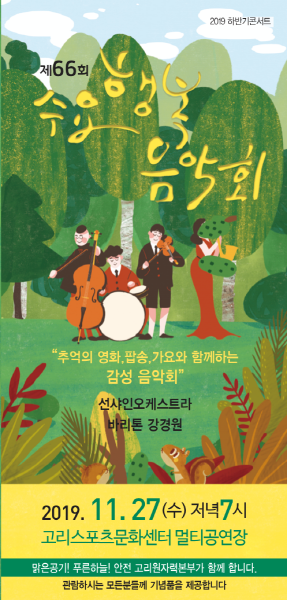 ‘추억의 영화·팝송·가요와 함께 하는 감성음악회’를 테마로 열리는 이번 음악회는 ‘선샤인 오케스트라’와 ‘바리톤 강경원’이 겨울바람을 녹여줄 잔잔하고 따뜻한 무대로 채울 예정이다.