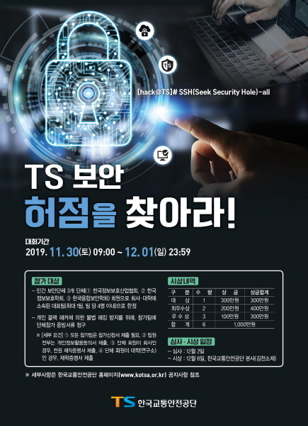 한국교통안전공단(이하 공단)은 오는 30일부터 12월 1일까지 웹서비스 취약점 발굴 및 보강을 위한 ‘TS 보안 허점을 찾아라!’ 대회를 개최한다고 밝혔다.