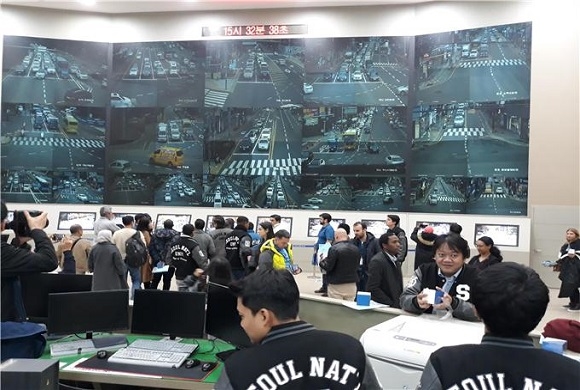 우선 시 교통의 컨트롤타워인 부산교통정보서비스센터에서 도시철도, 도로, 대중교통 등 대략적인 교통 운영현황을 설명했다. 투명 유리를 통해 부산의 교통 상황을 나타내는 대형 전광판 등을 통해 어떻게 운영되는지 상황을 각 인사들에게 보여줬다.
