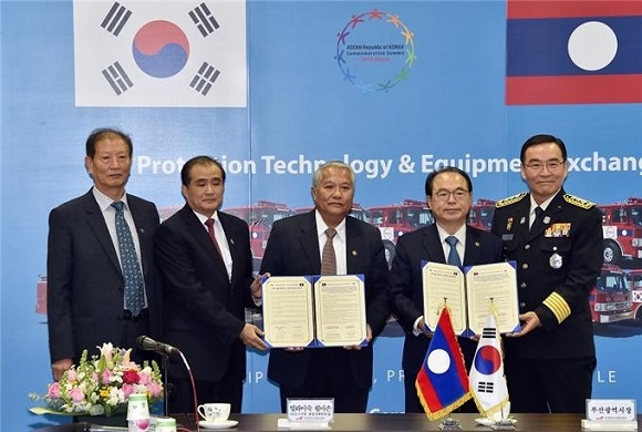 부산시가 대한민국과 라오스의 재수교 25주년을 기념하고 양국 간 교류 협력과 우호 증진을 위해 26일 오후 벡스코 제2전시장 소방종합대책상황실에서 ‘소방 기술 교류, 소방차 양여’ 협약을 맺었다.