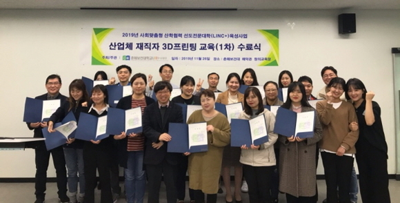 춘해보건대학교 LINC+사업단은 지난 26일 해악관 3층 창의교육장에서 ‘산업체 재직자 대상 3D 프린팅 교육’ 수료식을 가졌다고 27일 밝혔다.
