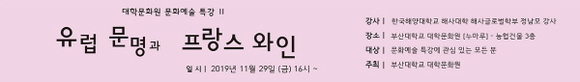 부산대 대학문화원은 오는 29일 오후 4시 교내 대학문화원 누마루(교수회관 3층)에서 정남모 한국해양대 해사글로벌학부 강사를 초청해 ‘유럽 문명과 프랑스와인’에 관한 문화·예술특강을 개최한다.