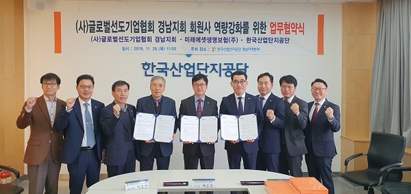 한국산업단지공단 경남지역본부는 지난 28일 본부 6층 소통회의실에서 글로벌선도기업협회 경남지회와 미래에셋생명보험 등 삼자간 '선도기업 회원사 역량강화를 위한 업무협약'을 체결했다.