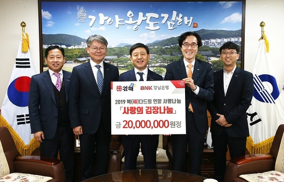 BNK경남은행은 지난 28일 2019 복(福)다드림 연말 사랑나눔활동의 일환으로 김해시에 '사랑의 김장나눔 후원금'을 기탁했다.