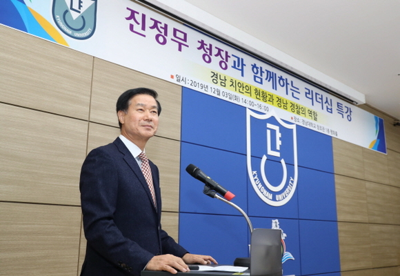 경남대학교는 3일 오후 2시 창조관 평화홀에서 ‘진정무 경남지방경찰청장과 함께하는 리더십 특강’을 개최했다고 밝혔다.