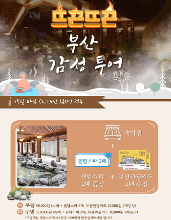 이 패키지는 객실 1실당 센텀 스파 2매, 부산관광카드 2매로 구성돼 1박 기준 주중 9만원, 주말 11만 9000원으로 이용할 수 있다.