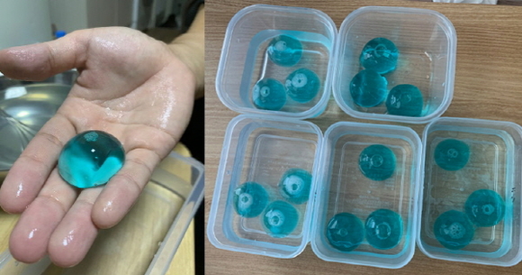 이들은 알지네이트와 반응하는 칼슘을 가글액에 넣은 뒤, 캡슐 모양을 만들기 위해 얼음틀을 이용해 가글액을 1회 사용량인 20㎖씩 얼렸다. 이렇게 얼린 가글액 덩어리를 알지네이트 용액에 담가 친환경 가글캡슐을 만들었다. 가글액이 녹으면서 가글액 속 칼슘이 알지네이트와 중합반응을 일으키며 표면에 막이 형성되는 원리다.