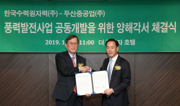 한국수력원자력(이하 한수원)과 두산중공업이 4일 서울 중구 더플라자호텔에서 ‘풍력발전사업 공동개발을 위한 양해각서’를 체결했다고 밝혔다.