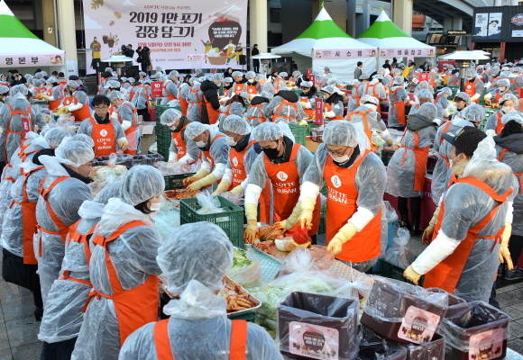 5일 사직야구장 정문에서 롯데그룹 계열사 주관 ‘사랑 나눔 1만 포기 김치 담그기’ 행사가 열린 가운데 참여자들이 김치에 양념을 버무리고 있다. 이날 롯데백화점, 롯데마트, 롯데건설 등 20여개 롯데 계열사 임직원과 부산여성소비자연합 회원 등이 참여해 만든 김치는 부산지역 취약계층에 전달될 예정이다. (사진=롯데쇼핑 제공)