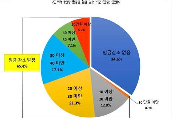 근로시간 단축으로 근로자 임금도 일부 줄어들 것으로 예측된다. 조사 기업의 65.4%가 근로자들의 월평균 임금이 줄어들 것이라고 응답했으며 감소 수준은 20~30만원 미만이 21.3%로 가장 많았다.