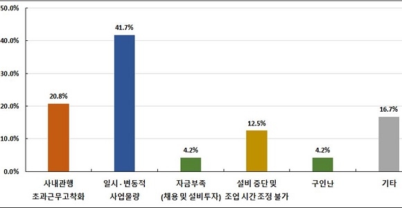 주 52시간제에 선제적 대응을 못하는 이유에서는 ‘일시변동적 사업 물량’을 원인으로 꼽은 기업이 41.7%로 가장 높았다. 이어 ‘사내 관행 초과근무 고착화’ 20.8%, ‘설비 중단, 조업 시간 조정 불가’ 12.5%, ‘채용, 투자 자금 부족’ 4.2%, ‘구인난’ 4.2% 순으로 응답 기업이 많았다.