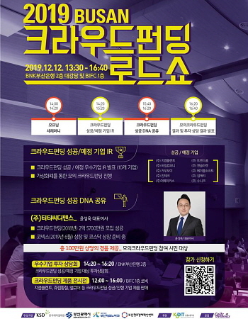 부산시가 오는 12일 오후 2시 부산은행 본점 2층 대강당에서 한국예탁결제원, 부산테크노파크 등과 함께 ‘2019 부산 크라우드 펀딩 로드쇼’를 개최한다고 11일 밝혔다.