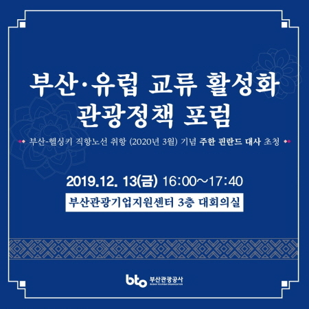 부산관광공사가 오는 13일 오후 4시부터 부산관광기업지원센터 대회의실에서 ‘부산-유럽 교류 활성화 관광정책 포럼’을 개최한다고 11일 밝혔다.