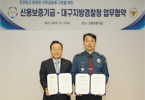 신용보증기금(신보)과 대구지방경찰청이 범죄로부터 안전한 지역사회를 만들고 사회적 약자를 보호하기 위해 11일 신보 본점에서 ‘범죄 예방 환경개선 사업’ 협약을 체결했다고 밝혔다.