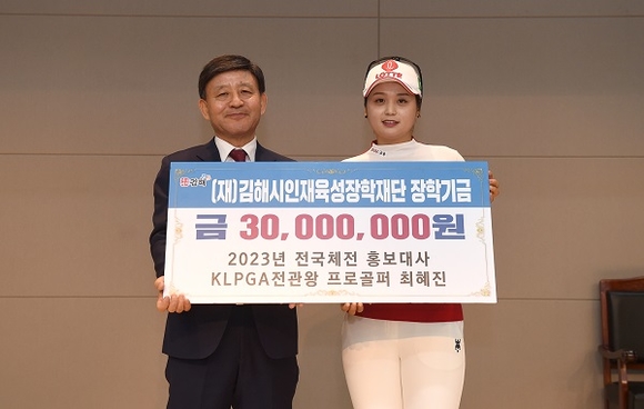 그는 김해중소기업비즈니스센터에서 시민교양강좌로 열린 '최혜진의 골프쇼'에서 지역의 저소득 학생과 예체능 인재들을 위해 써 달라며 장학금을 전달했다.