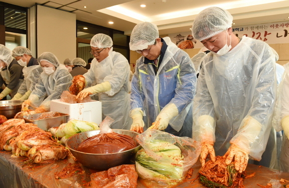 이날 행사에는 부경대 김영섭 총장이 직접 배추에 양념을 치대는 등 학교 직원 50여 명이 참가해 배추 250포기로 김장김치를 담갔다.