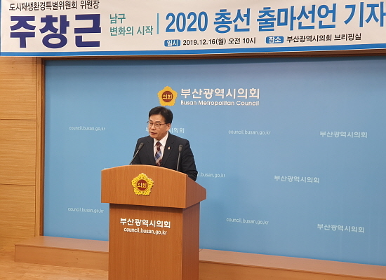 민주당 부산시당 주창근 도시재생환경위원장이 16일 오전 부산시의회 브리핑실에서 기자회견을 열고 오는 21대 부산 남구갑 지역구 총선 출마를 선언했다.