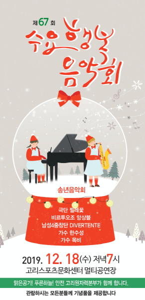 이번 공연은 마지막 주 수요일이 성탄절임을 고려해 한 주 앞당겨 개최한다. 기타 문의는 고리원자력본부 지역협력팀으로 하면 된다.