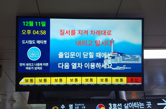 부산도시철도 열차 혼잡도 안내시스템은 지난해 12월 처음 구축돼 1년 동안 시범 운영됐다. 이는 승강장에 설치된 행선안내기 모니터 하단에 열차 모양과 색깔로 객실별 혼잡도가 표출되는 방식이다.