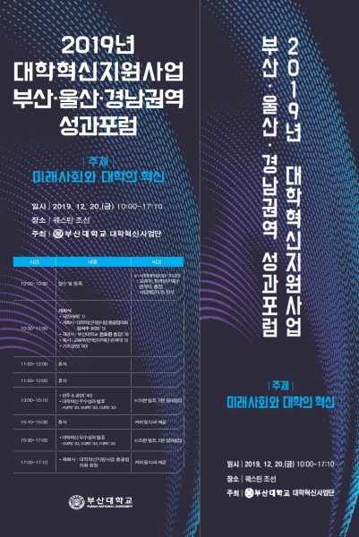 부산대학교 기획처 대학혁신사업단은 오는 20일 부산 웨스틴조선호텔 2층 주니어 볼룸(Junior Ballroom)에서 대학혁신지원사업의 우수성과를 발굴·공유하고 참여 대학 간 교류와 발전 방향을 모색하는 ‘2019년 대학혁신지원사업 부산·울산·경남권역 성과포럼’을 개최한다고 18일 밝혔다.