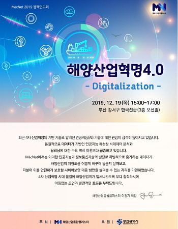 해양산업통합클러스터가 부산시와 함께 19일 부산 강서구 소재 한국선급 3층 오션홀에서 ‘해양산업혁명 4.0 Digitalization’ 정책연구회를 연다고 밝혔다.