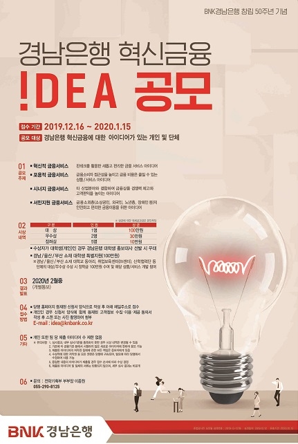 경남은행은 내년 1월 15일까지 '창립 50주년 기념 BNK경남은행 혁신금융 아이디어(금융규제 샌드박스)' 공모 이벤트를 진행한다고 19일 밝혔다.