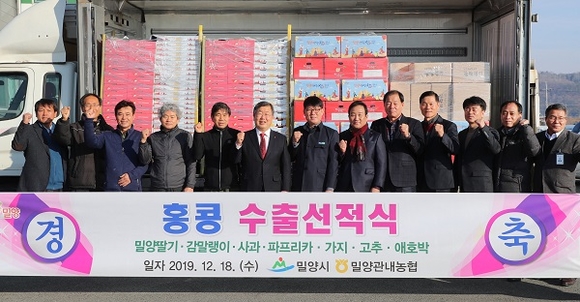 경남 밀양시는 18일 밀양농업 원예 APC에서 박일호 시장, 수출 농가, 농협 등 15여 명이 참석해 밀양 농산물 홍콩 수출 첫 선적식을 가지고 본격 수출을 알렸다.
