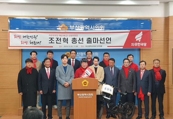 조전혁 자유한국당 부산시당 해운대갑 당협위원장이 20일 부산시의회 브리핑실에서 기자회견을 열고 내년 총선에 출마할 것을 선언했다.